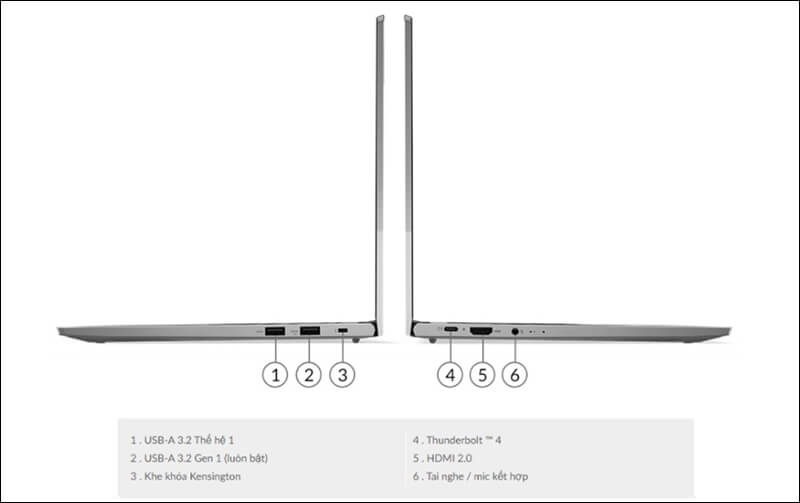 Tuy là một chiếc laptop gọn nhẹ nhưng hai bên cạnh máy của Lenovo ThinkBook 13s G2 ITL  vẫn được trang bị đầy đủ các cổng kết nối cần thiết bao gồm: 1 cổng USB 3.2 Gen 1, 1 cổng Thunderbolt 4, 1 cổng HDMI 2.0b, 1 cổng mircophone combo jack 3.5 mm. Nhờ vậy mà chiếc máy này có thể kết nối với các thiết bị ngoại vi một cách dễ dàng, nhanh chóng.