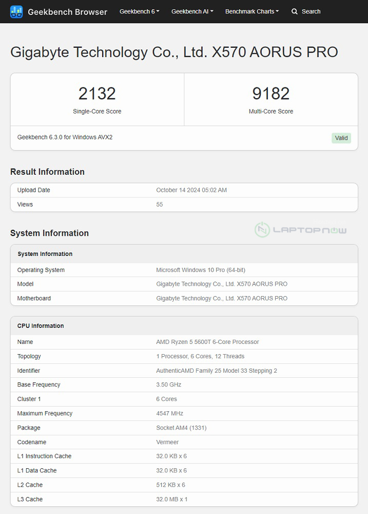 Ryzen 5 5600T đã được kiểm tra trên Geekbench 6.3.0, với bo mạch sử dụng là Gigabyte X570 AORUS PRO. Điều này có nghĩa là các bo mạch X570 của Gigabyte có thể đã hỗ trợ các chip mới, nhưng trang web chính thức chưa được cập nhật. Chúng ta thấy rằng CPU này có xung nhịp cơ bản 3.5GHz và xung nhịp tối đa 4547MHz (gần 4.6GHz).