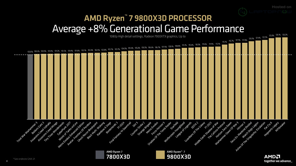 AMD Ryzen 7 9800X3D hiện đang được liệt kê trong hướng dẫn cạnh tranh là đối thủ của các chip gaming hàng đầu của Intel, bao gồm Core i9-14900KS và Core i9-14900K, trong khi Core Ultra 9 285K không thể so sánh với các thế hệ trước của nó. Ryzen 7 9800X3D nhanh hơn khoảng 8% ở độ phân giải 1080p so với Ryzen 7800X3D, vốn đã là chip nhanh nhất trên thị trường.