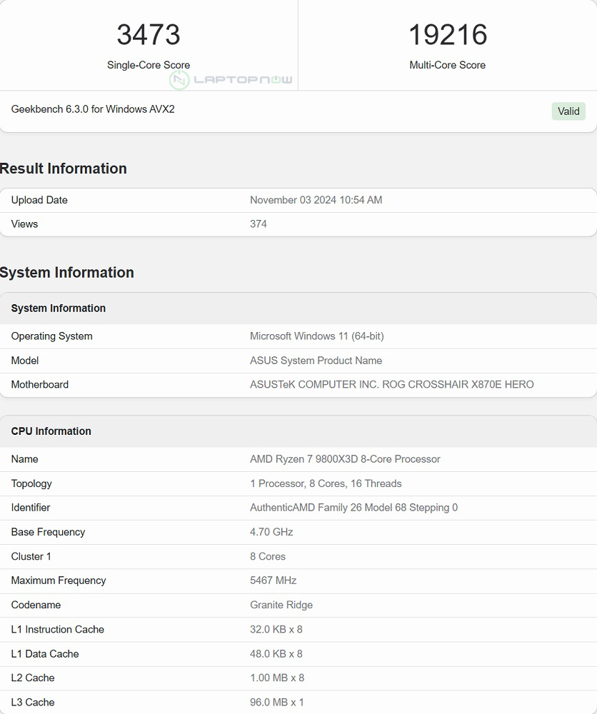 AMD Ryzen 7 9800X3D 3D V-Cache đã được thử nghiệm trên Geekbench 6.3, sử dụng bo mạch chủ ROG Crosshair X870E Hero với bộ nhớ DDR5-6000 32 GB. Trong các bài kiểm tra trước đó, chúng ta đã thấy PBO có thể đẩy tốc độ xung nhịp lên gần 5.3 GHz (5.2 GHz mặc định), nhưng lần này, CPU đã đạt khoảng 5.5 GHz.