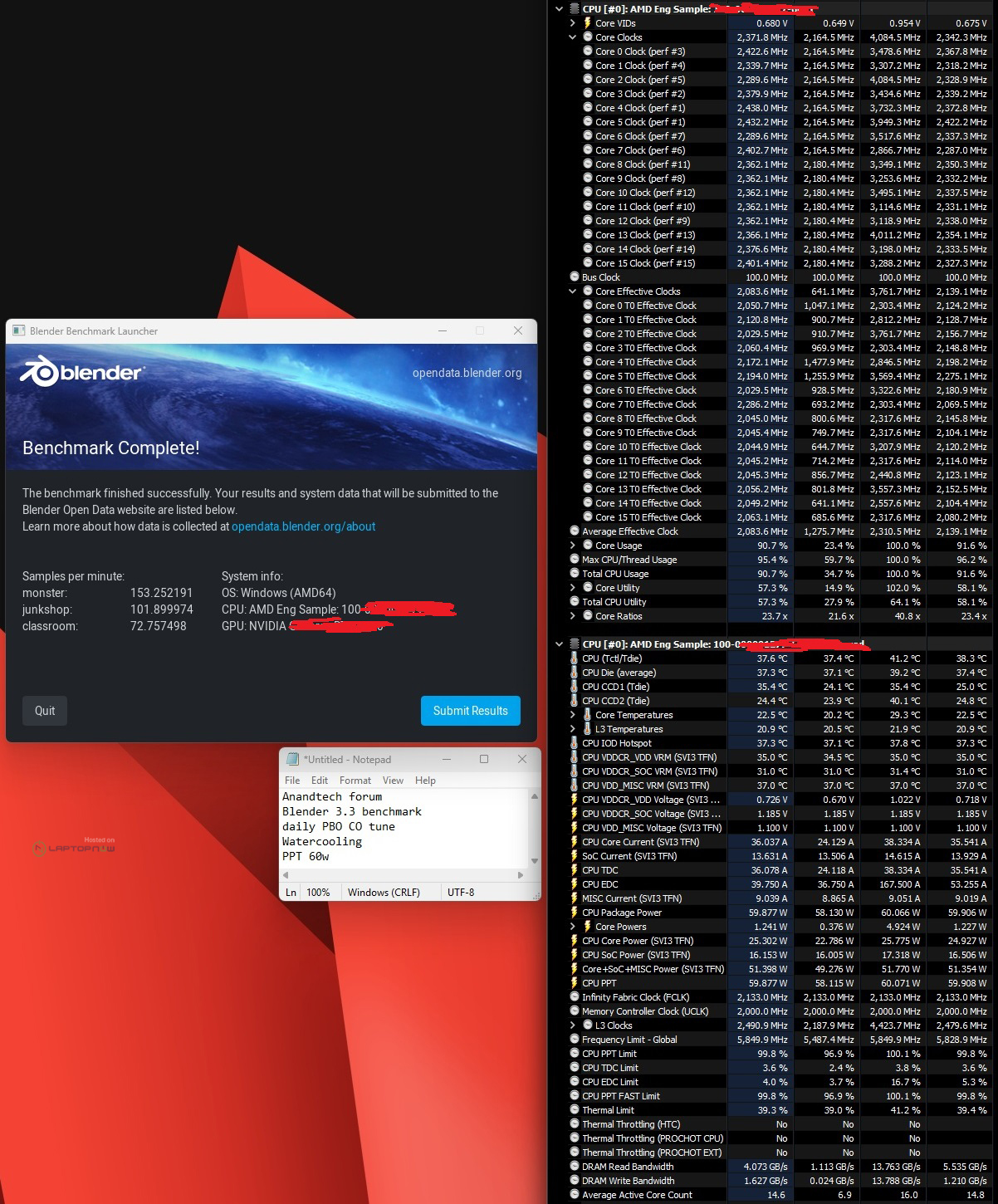Ngoài các số liệu FMAX, vi xử lý AMD Ryzen 9 9950X 16 nhân được cho là đã được thử nghiệm trong bài đo Blender nhưng chỉ với PPT được thiết lập là 60W, thấp hơn 110W so với TDP mặc định là 170 watt của nó. Vi xử lý được làm mát bằng nước và chúng ta thấy rất nhiều chỉ số. Hiệu suất gần như sánh ngang với Core i9-12900K chỉ với 60W điện.