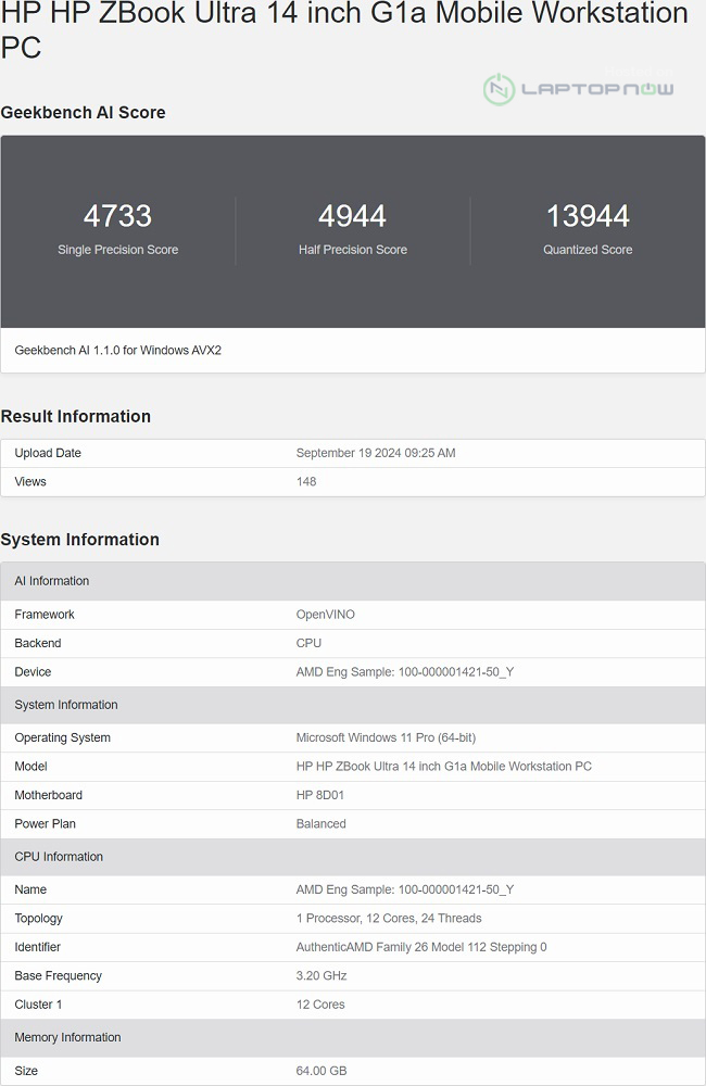Trang kết quả Geekbench cho thấy bộ xử lý được xác định là 'AuthenticAMD Family 26 Model 112 Stepping 0', cùng với thiết bị mà nó thuộc về. HP ZBook Ultra 14-inch G1a Mobile Workstation PC là chiếc laptop đã được benchmark trong các bài kiểm tra AI, đạt 4733 điểm trong phép đo đơn, 4944 trong phép đo bán chính xác và 13944 trong các bài kiểm tra định lượng.