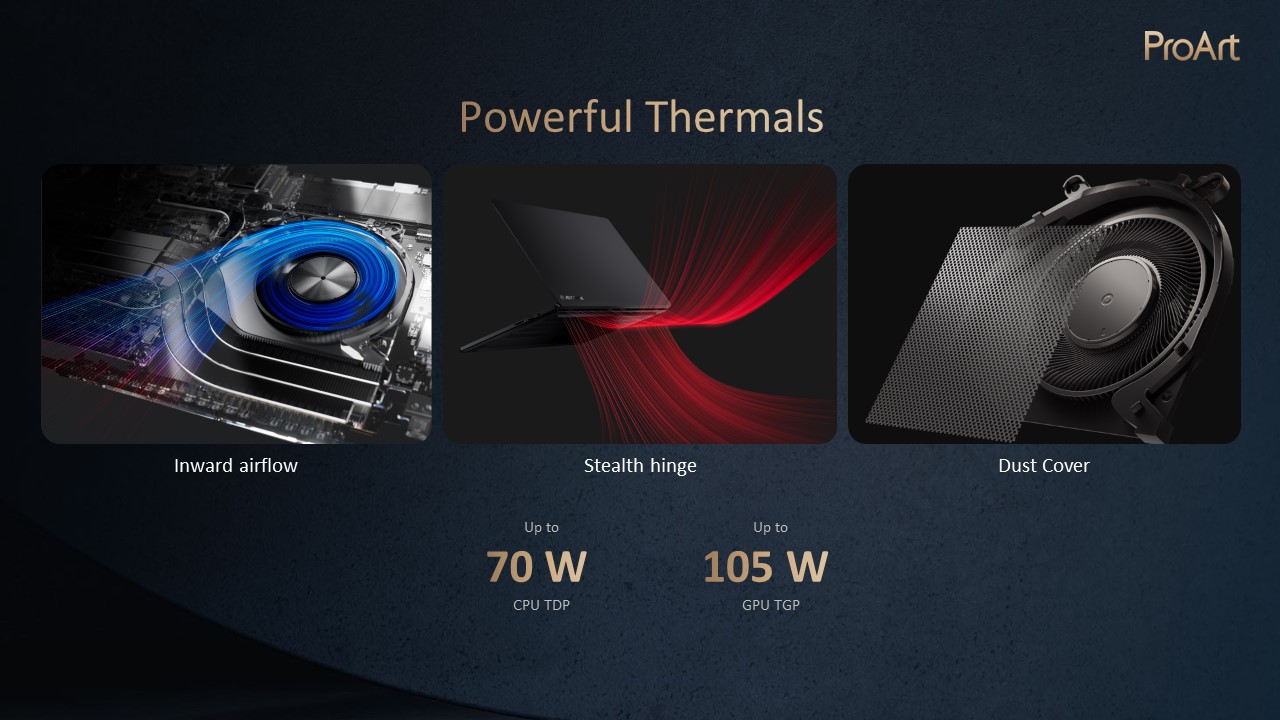 Theo Asus, bộ tản nhiệt của ProArt P16 có TDP lên tới 70 W (cho CPU) và lên tới 105 W (cho GPU).