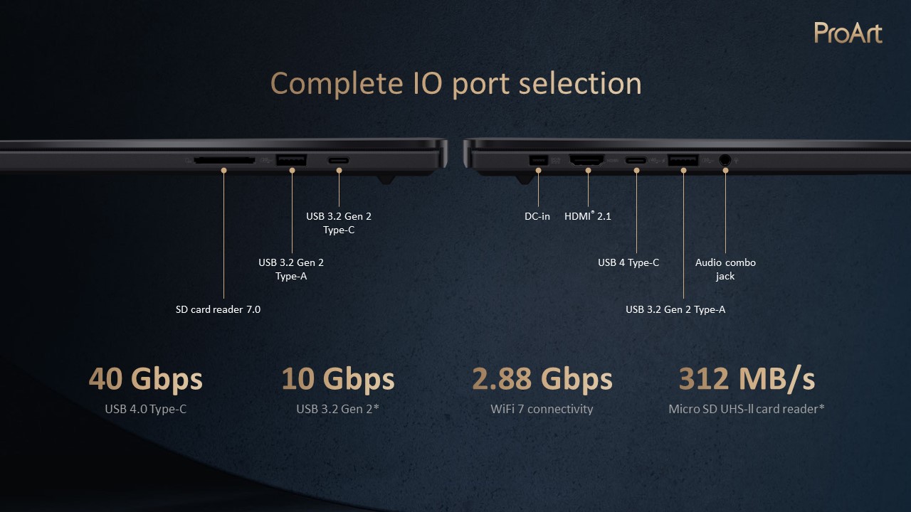 Bàn di số ProArt đặc trưng được tích hợp vào touchpad. ProArt 16 trang bị cổng USB 4 40 Gbps và kết nối mạng Wi-Fi 7.