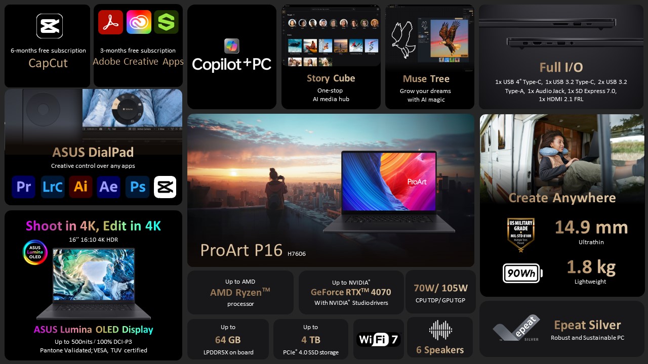 Các APU AMD Strix Point mới được công bố hôm nay cung cấp hiệu suất NPU cao nhất 50 TOPS, khiến chúng hoàn toàn phù hợp với hệ sinh thái Copilot+ PC. Ngoài ra, ProArt P16 cũng đi kèm với các tùy chọn GPU lên đến GPU laptop Nvidia GeForce RTX 4070 để đạt được tổng cộng 321 TOPS độ tốt của AI.