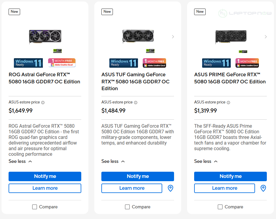 Nếu bạn vào trang web chính thức của ASUS, bạn sẽ thấy tất cả các phiên bản RTX 5090 và RTX 5080, một số trong đó có niêm yết giá MSRP. Tại thời điểm viết bài, chỉ có một GPU đang được bán với mức giá MSRP, đó là PRIME GeForce RTX 5080 với giá 999 USD.
