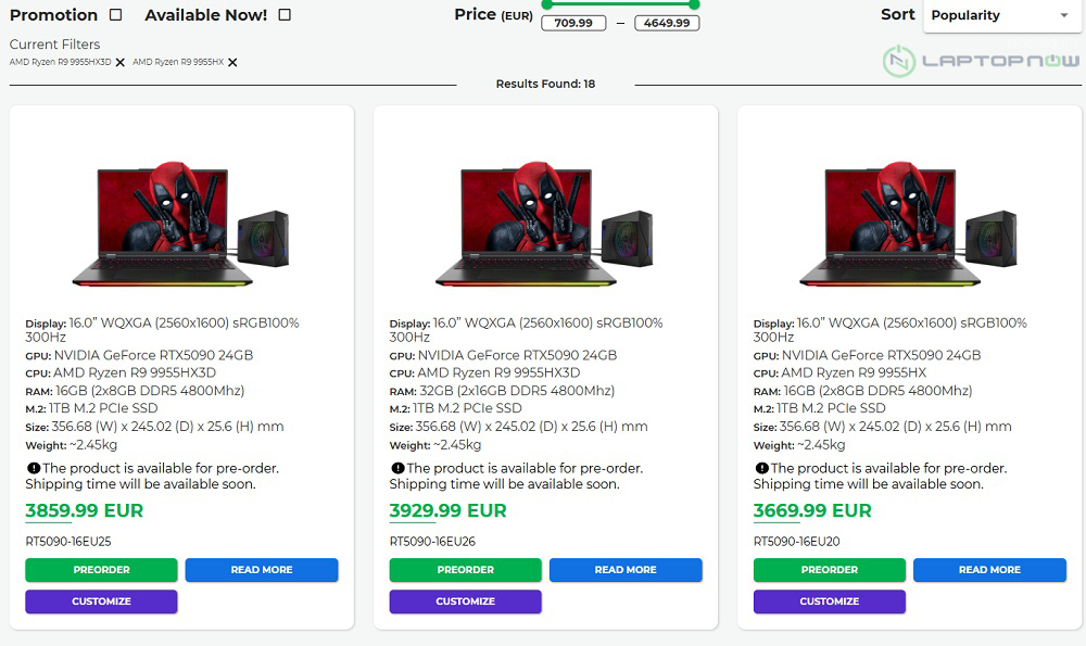 Đối với các cấu hình với Ryzen 9 9955HX3D, phiên bản rẻ nhất có giá 2526 EUR với RTX 5070 Ti, nhưng một phiên bản khác với Ryzen 9955HX cũng có sẵn với mức giá thấp hơn là 2320 EUR.