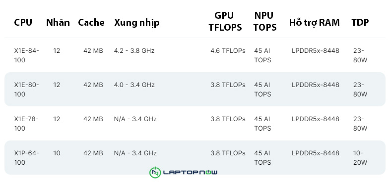 Những con chip này có tới 12 lõi, 42 MB bộ nhớ cache, tốc độ xung nhịp lên đến 4.2 GHz, hiệu suất AI lên đến 45 TOPS, hỗ trợ bộ nhớ LPDDR5x-8448 và phạm vi TDP rộng từ 23W đến 80W.