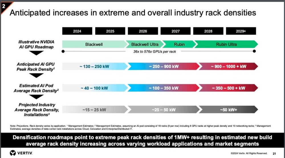 Nói về con số 1.000 KW, phân tích của Vertiv cho biết cột mốc mật độ rack máy chủ này sẽ đạt được khi các máy chủ AI "Rubin Ultra" của NVIDIA ra mắt. Điều này cho thấy rằng dòng sản phẩm thế hệ tiếp theo sẽ mang đến hiệu suất cực kỳ mạnh mẽ và có thể được coi là "cách mạng" đối với các thị trường.