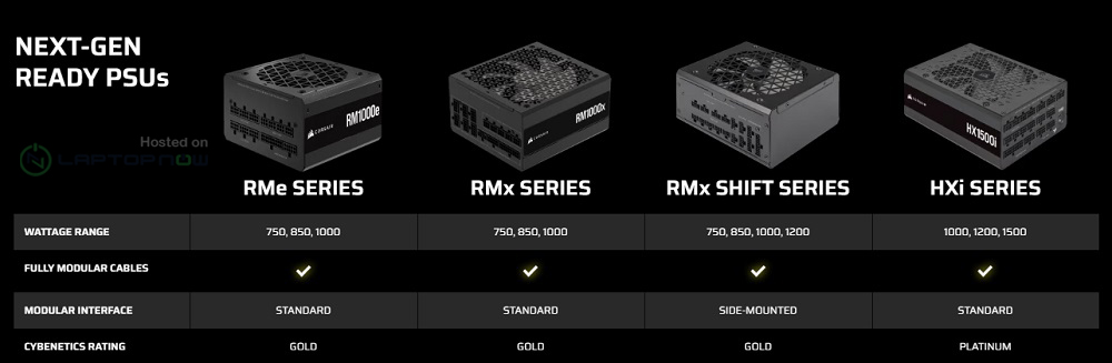 Cụ thể hơn, các bộ nguồn "sẵn sàng cho thế hệ tiếp theo" của Corsair bao gồm các dòng RMe, RMX và RMx SHIFT, tất cả đều có cáp hoàn toàn mô-đun và chứng nhận Cybenetics Gold.