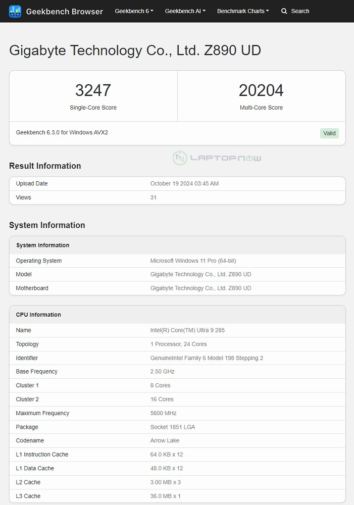 CPU đạt 3247 điểm ở bài kiểm tra đơn nhân và 20204 điểm ở bài kiểm tra đa nhân trong Geekbench 6. Điều này giúp nó tương đương với CPU Core i9 14900K, vốn có 32 luồng, trong khi Core Ultra 9 285 có ít hơn 8 luồng do không có hyperthreading. CPU cũng cung cấp hiệu suất đơn nhân rất tốt.