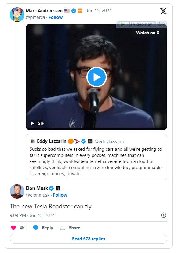 Elon Musk tái khẳng định trên X về việc Tesla Roadster có thể bay.