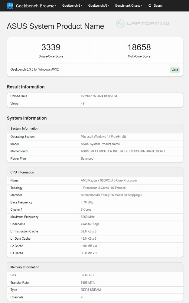 Đây là lần đầu tiên một CPU X3D có hiệu suất lõi đơn và đa luồng cao hơn so với phiên bản không phải X3D, làm cho nó trở thành lựa chọn lý tưởng cho cả chơi game và công việc. Như chúng ta thấy từ trang thông số trên Geekbench, CPU này có xung nhịp cơ bản 4.7 GHz và xung nhịp tối đa 5.27 GHz. Có thể xung nhịp tối đa đã vượt 5.2 GHz do PBO được kích hoạt, và không có gì ngạc nhiên khi gần đây chúng ta thấy Ryzen 9800X3D đạt trên 5.6 GHz.