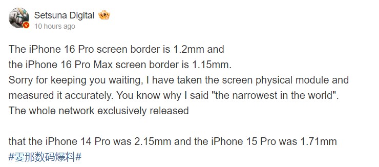 Một tài khoản weibo có tên Setsuna Digital tuyên bố rằng iPhone 16 Pro Max sẽ có viền mỏng chỉ 1,15 mm. Với iPhone 16 Pro, tin đồn nói rằng viền bezel sẽ có kích thước 1,20mm, vẫn mỏng đến mức không thể tin được.