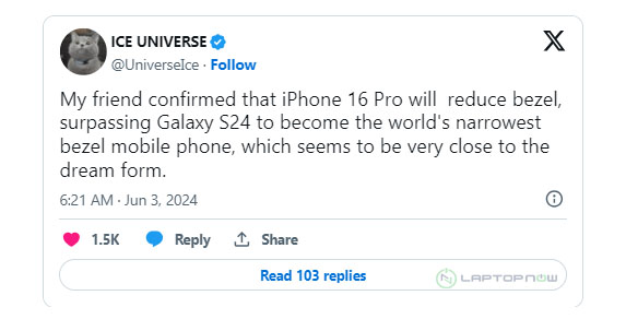 Cụ thể, Ice Universe khẳng định rằng iPhone 16 Pro sắp ra mắt sẽ giảm kích thước viền bezel hơn nữa, có khả năng vượt qua cả Samsung S24 Ultra và giành vương miện cho viền bezel mỏng nhất trên điện thoại thông minh.