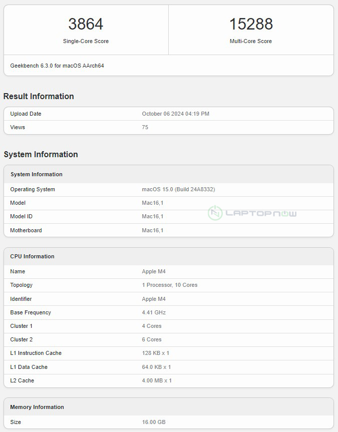 M4 Mac mang mã định danh Mac16,1 vừa được kiểm tra trên Geekbench 6, đạt được điểm số đơn nhân là 3,864 và đa nhân là 15,288. M4 trong mẫu này là phiên bản cao cấp nhất với bốn lõi hiệu suất và sáu lõi tiết kiệm năng lượng, hoạt động ở tần số tối đa là 4.41GHz.
