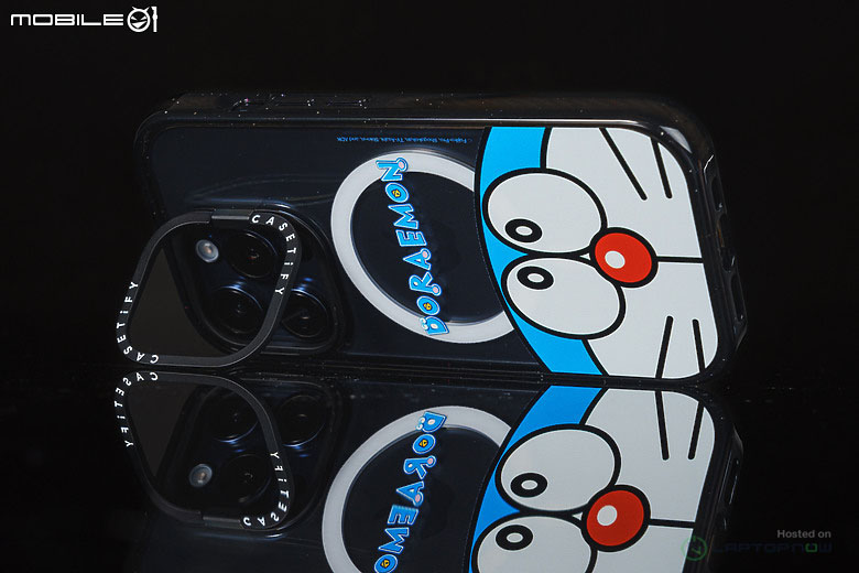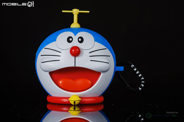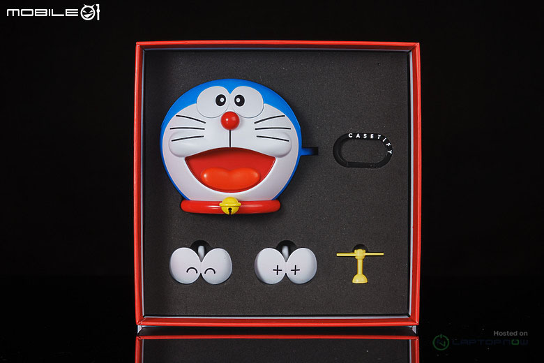Hộp bảo vệ tai nghe thực chất là bộ chuyển đổi trực tiếp từ đầu của Đôrêmon. Ngoài ra còn có logo phù điêu ba chiều của Đôrêmon ở mặt sau và dòng chữ CASETiFY được đặt khéo léo trên đó.