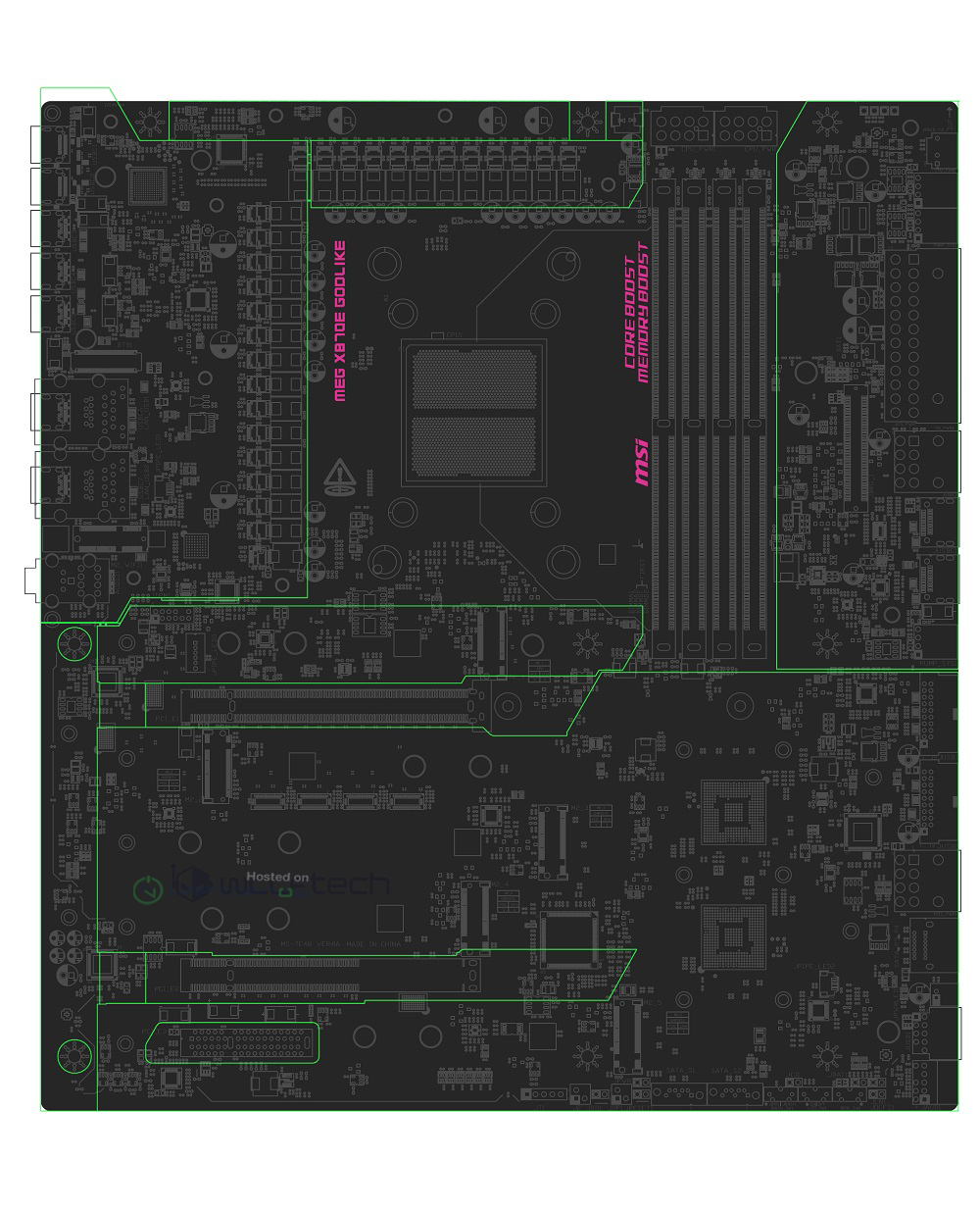Bo mạch chủ MSI MEG X870E GODLIKE có 28 pha cung cấp điện với các giai đoạn cung cấp 110A. Đây là thêm 1 VRM so với X670E GODLIKE, vốn được trang bị các giai đoạn cung cấp 105A. CPU được cung cấp điện bởi hai kết nối 8-pin và một kết nối nguồn 24-pin (ATX) cung cấp nguồn cho toàn bộ bo mạch. Bốn khe DIMM DDR5 hỗ trợ tốc độ DIMM trên 8000 MT/s và dung lượng lên đến 256 GB với các mô-đun 64 GB mới nhất. Bo mạch chủ cũng có tất cả các tính năng hữu ích như DEBUG & EZ DEBUG LED cùng với các công tắc nguồn/reset.