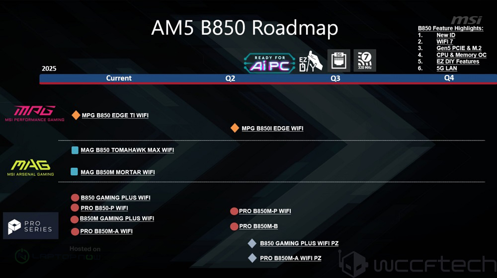 Về tính năng, các bo mạch chủ MSI AM5 "B850" sẽ hỗ trợ các tính năng IO mới nhất, bao gồm hỗ trợ WIFI 7, các khe cắm PCIe/M.2 Gen5, khả năng ép xung CPU và bộ nhớ, nhiều tính năng EZ DIY và LAN 5G.