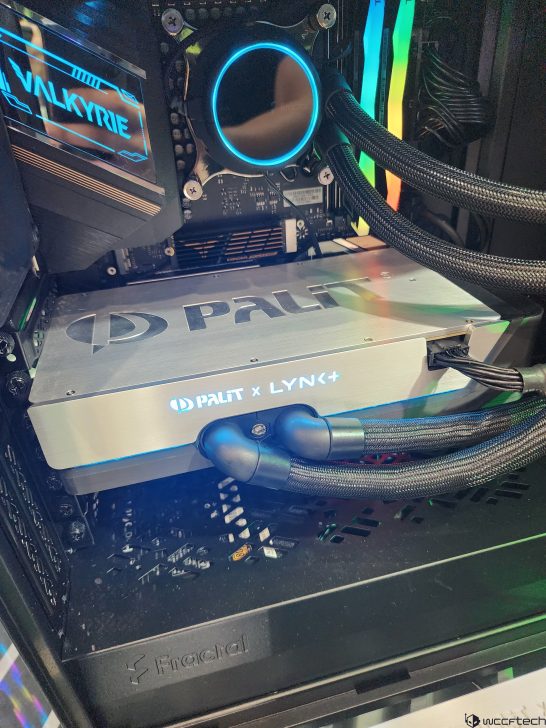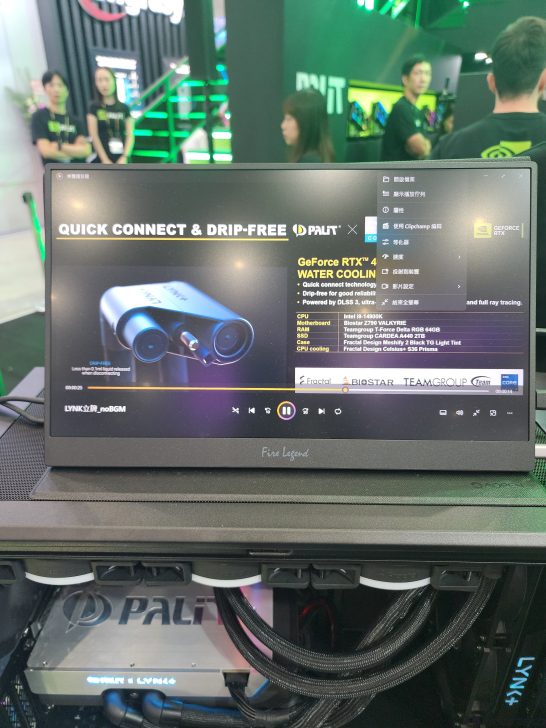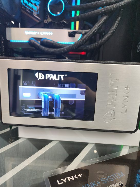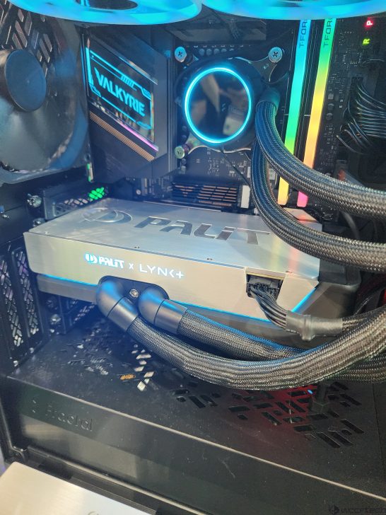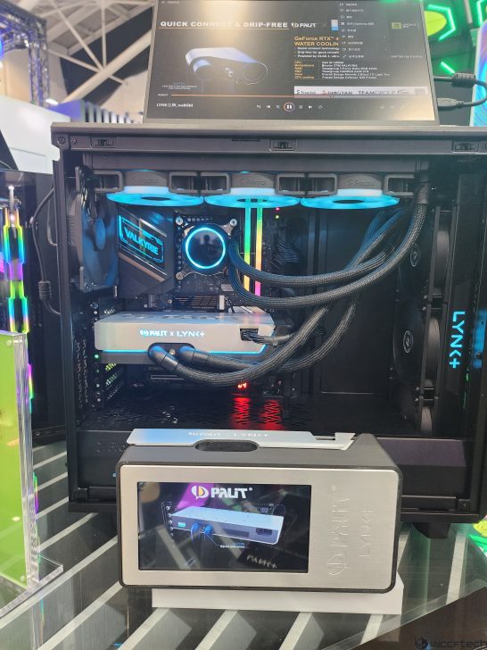 Đầu tiên, chúng ta phải nói về mẫu máy hàng đầu là Lynk+. Model này được thiết kế dựa trên GPU GeForce RTX 4090 của NVIDIA và là sự hợp tác với Lynk+ trong việc tích hợp giải pháp làm mát kết nối nhanh công nghệ mới có thiết kế không nhỏ giọt (chất lỏng thoát ra 0,1 mm khi ngắt kết nối) và có một tấm che 4 khe lớn; có đèn LED RGB và tính thẩm mỹ đen trắng đẹp mắt với logo Palit lớn ở mặt sau và logo Palit x Lynk+ ở hai bên.