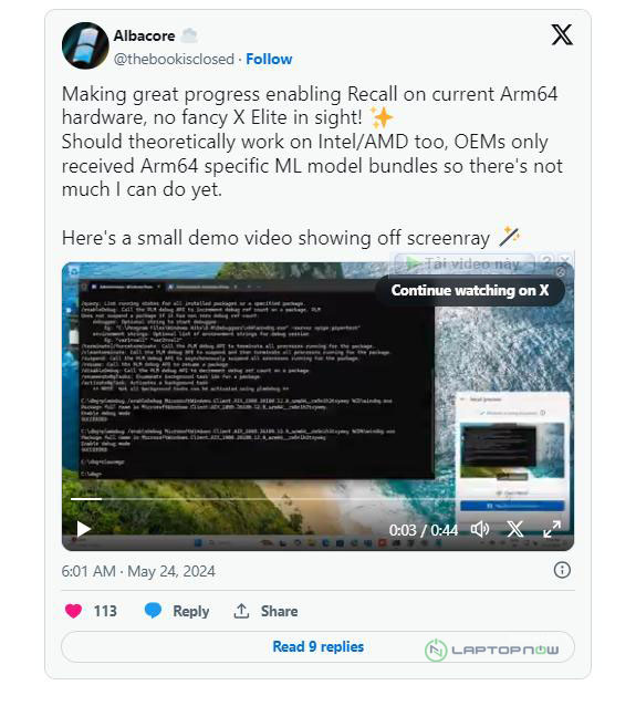 Xem video tại đây để thấy rõ một máy tính chạy chip ARM64 vẫn có thể sử dụng được tính năng Recall.