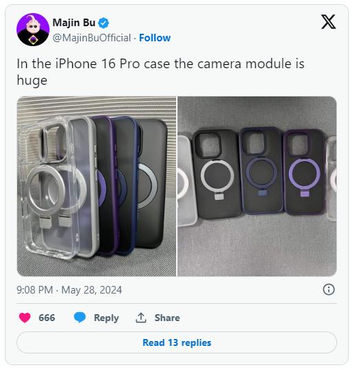 Tipster Majin Bu đã chia sẻ những hình ảnh về ốp lưng iPhone 16 Pro, làm nổi bật kích thước của lỗ khoét camera. Điều này cho thấy những nâng cấp về camera được đồn đại có thể khiến thiết lập camera lớn hơn một chút so với các mẫu máy hiện tại.