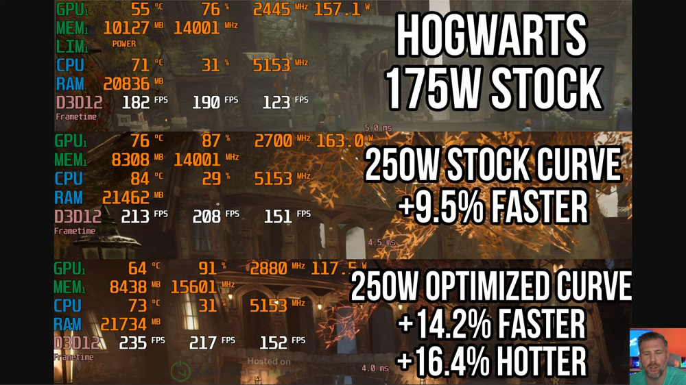 Trong tựa game Black Myth: Wukong, hiệu suất tăng lên đến 23,3%, và trong Cyberpunk 2077, mức tăng đạt 21,7% so với phiên bản 175W. Các bài kiểm tra tổng hợp khác cũng cho thấy mức cải thiện tương tự.