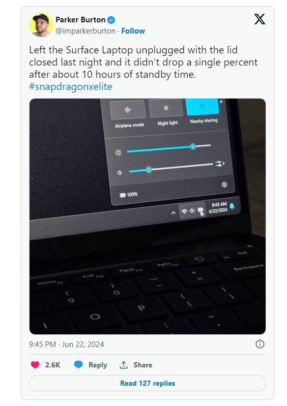 Parker Burton đã chứng minh khả năng ấn tượng của Surface Laptop 7 và hiệu quả của Snapdragon X Elite khi ngay cả khi nắp được đóng trong 10 giờ, không có một phần trăm pin nào bị giảm. Điều này cho thấy Microsoft đã giải quyết thành công vấn đề tiêu hao điện năng ở chế độ chờ, hoặc hiệu suất năng lượng vượt trội của Snapdragon X Elite có nghĩa là ngay cả khi vấn đề này chưa được giải quyết, nó sẽ không gây ra vấn đề cho những ai sở hữu Surface Laptop 7.