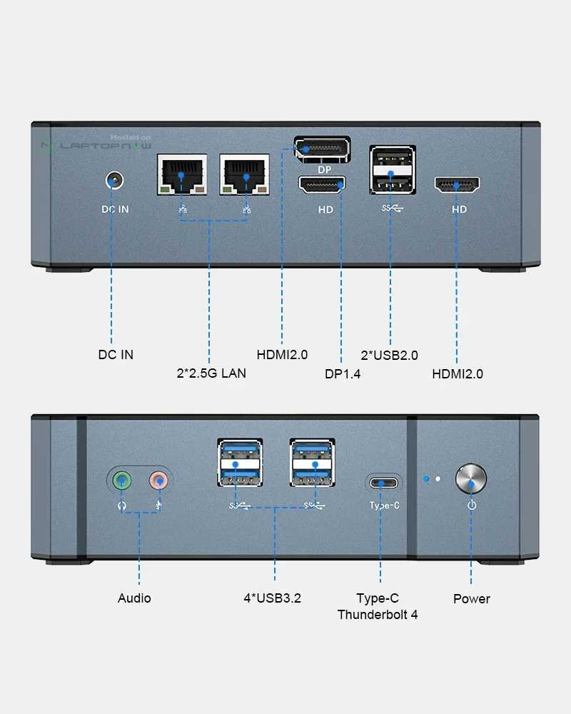 PC kích thước 167 x 127 x 47 mm hỗ trợ sử dụng tối đa ba màn hình. Nó có một cổng DisplayPort 1.4 và một cổng USB-C với Thunderbolt 4, cùng với hai cổng HDMI 2.0. Ngoài ra, có bốn cổng USB 3.2 và các giắc cắm riêng cho đầu ra âm thanh và microphone ở phía trước. Ở phía sau, có hai cổng USB 2.0 và hai cổng Ethernet với tốc độ truyền dữ liệu tối đa 2,5 GBit/s. WiFi 6 và Bluetooth 5.2 cũng được tích hợp sẵn.