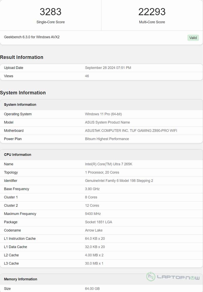 CPU Intel Core Ultra 7 265K "Arrow Lake" đã ghi được 3283 điểm trong bài kiểm tra đơn nhân và 22293 điểm trong bài kiểm tra đa nhân. Điều này đưa chip lên đầu bảng xếp hạng trong đánh giá hiệu suất Geekbench 6 với hiệu suất đơn nhân và đa nhân cao nhất. Cần lưu ý rằng Core Ultra 9 285K cũng đã xuất hiện trong benchmark với kết quả hiệu suất đơn nhân và đa nhân mạnh hơn.