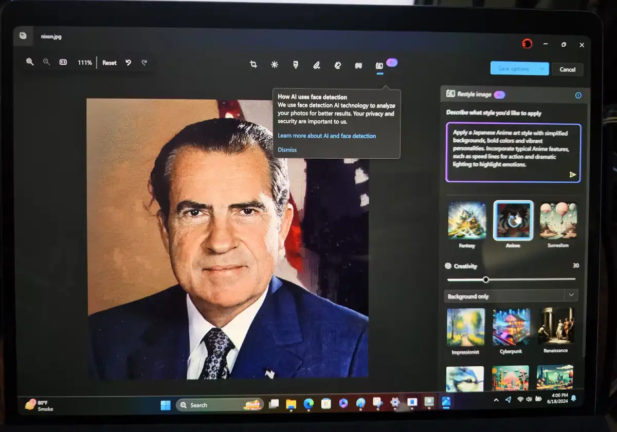 Trong Photos, có cảnh báo về thành phần AI mới gọi là Restyle, sử dụng AI để thay đổi nền ảnh. Nỗ lực của tôi với chân dung Richard Nixon không tốt lắm, cần thêm thời gian thử nghiệm.