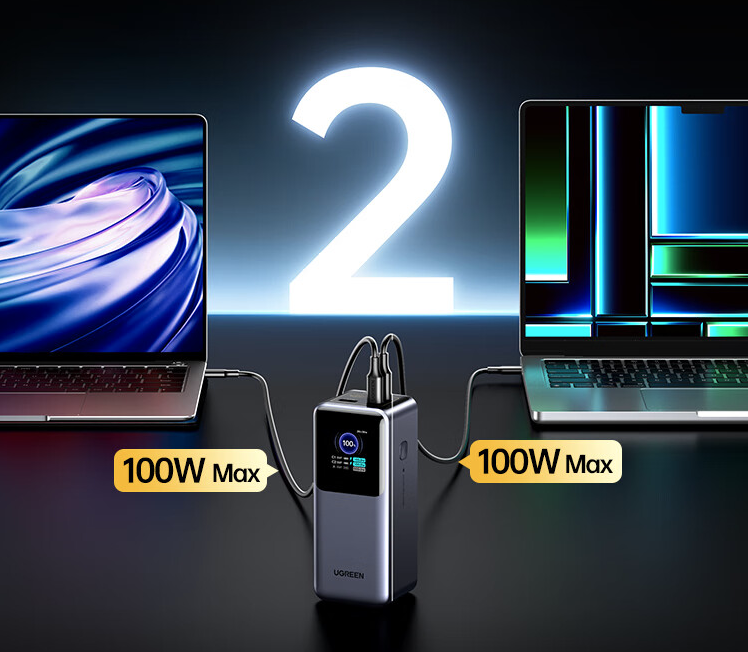 Pin sạc dự phòng có thể cung cấp đầu ra 2 cổng 200W nhờ công nghệ SmartCharge của UGREEN. Khi sử dụng cả 3 cổng, cổng USB-C đầu tiên cung cấp 140W, với hai cổng còn lại giới hạn ở mức 20W mỗi cổng.